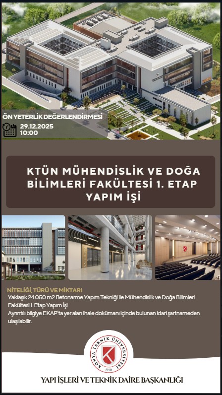 📢 İhale Duyurusu Birimimiz tarafından yürütülen, 2025/1982420 İKN’li "KTÜN Mühendislik ve Doğa Bilimleri Fakültesi 1.Etap Yapım İşi" İhalesi Kamu İhale Bülteninde yayımlanmıştır.