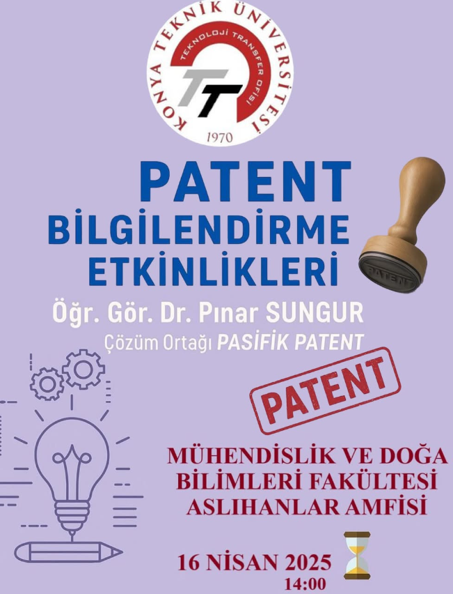 Konya Teknik Üniversitesi Teknoloji Transfer Ofisi’nin öncülüğünde, akademisyen ve öğrencilerimize özel olarak düzenlenecek Patent Bilgilendirme Etkinliğinde buluşuyoruz!