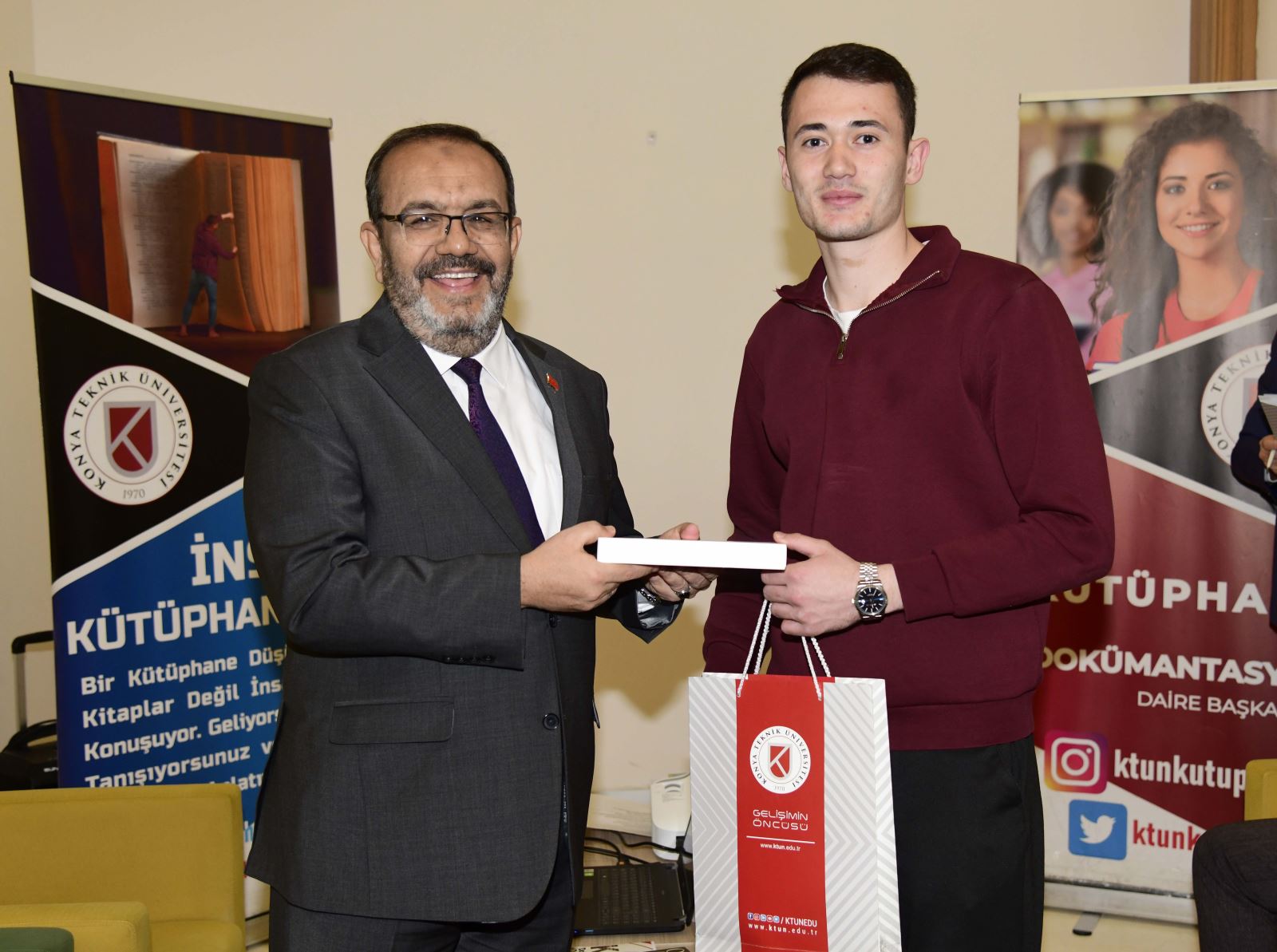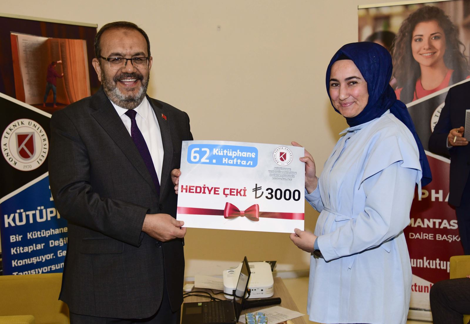 Programın devamında geleneksel ödül törenine geçildi. 2025 yılında en fazla kitap okuyan ve veri tabanlarını en etkin kullanan kütüphane kullanıcılarına ödülleri, Rektör Prof. Dr. Osman Nuri Çelik ile Rektör Yardımcısı Prof. Dr. Ali Köken tarafından takdim edildi.