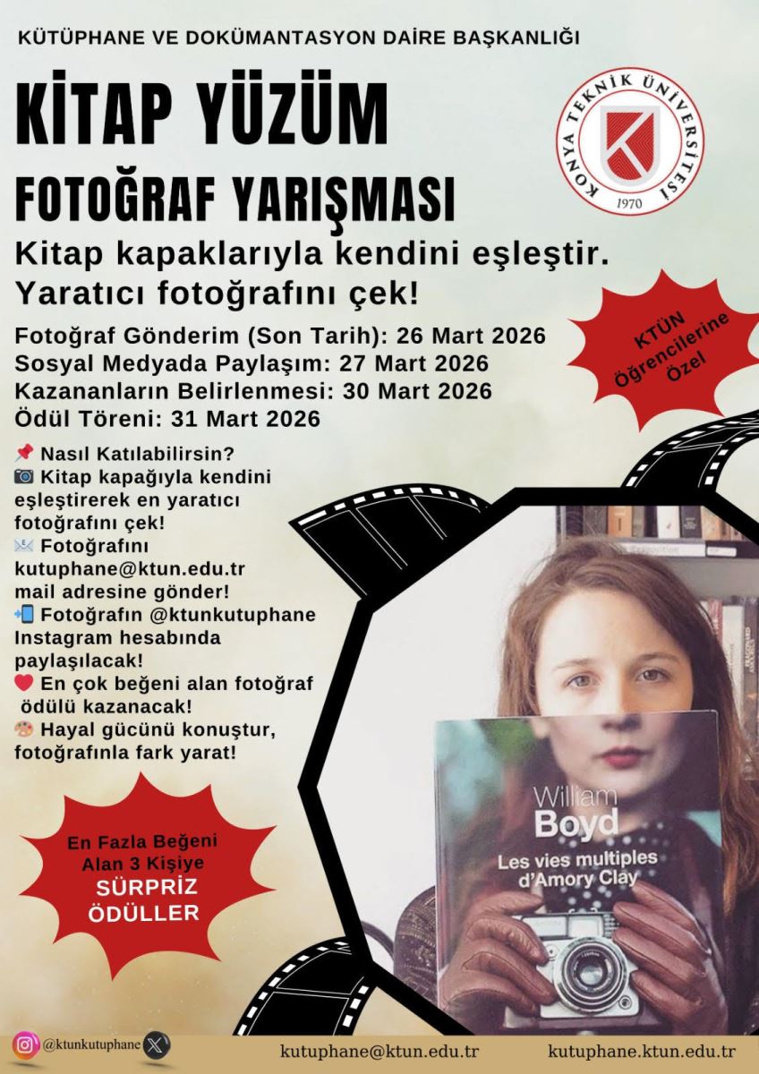 Değerli Kullanıcılarımız, 62. Kütüphane Haftası kutlama etkinlikleri kapsamında "Kitap Yüzüm Fotoğraf Yarışması" düzenlenecektir. Yarışmanın detayları afişte yer almaktadır. Kitap yarışma etkinlik KTUN kütüphane