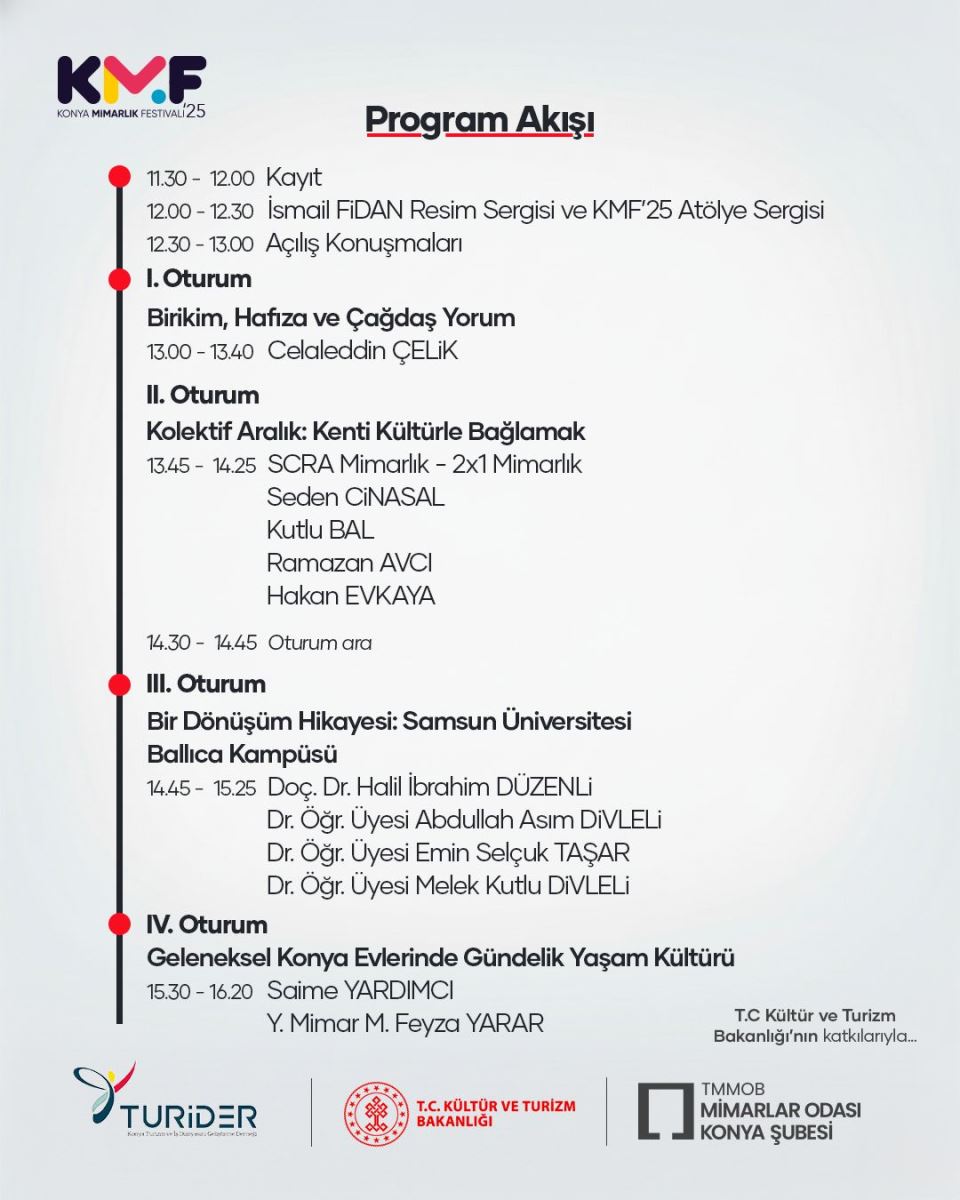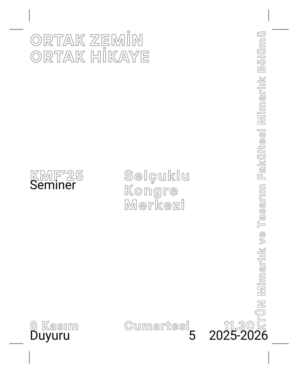 Dr. Öğr. Üyesi Abdullah Asım Divleli, Dr. Öğr. Üyesi Melek Kutlu Divleli ve Yüksek Mimar Feyza Yarar adlı mezun öğrencilerimizin de bulunduğu değerli hocalarımız ve mimarlarımızın katkılarıyla gerçekleştirilen "Ortak Zemin, Ortak Hikaye" semineri 8 Kasım Cumartesi günü saat 11.30'da Selçuklu Kongre Merkezinde gerçekleşmiştir.