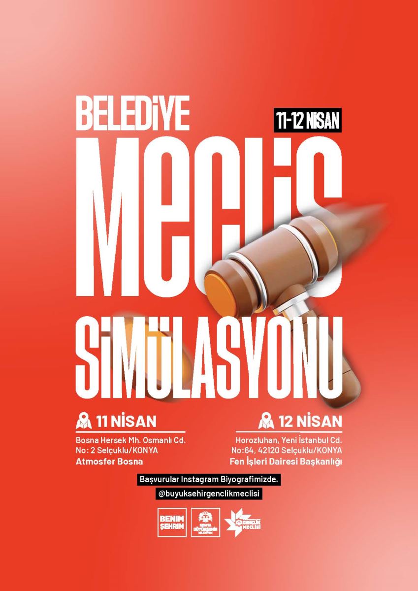 Konya Büyükşehir Belediyesi Gençlik Meclisi tarafından organize edilen Meclis Simülasyonu Etkinliği; Gençlerin yerel yönetim süreçlerini tanıması, müzakere kültürünü geliştirmesi ve şehir yönetimine dair farkındalık kazanması amacıyla oluşturulmuş bir simülasyon etkinliğidir.