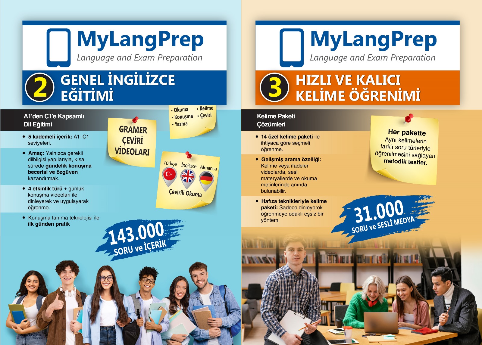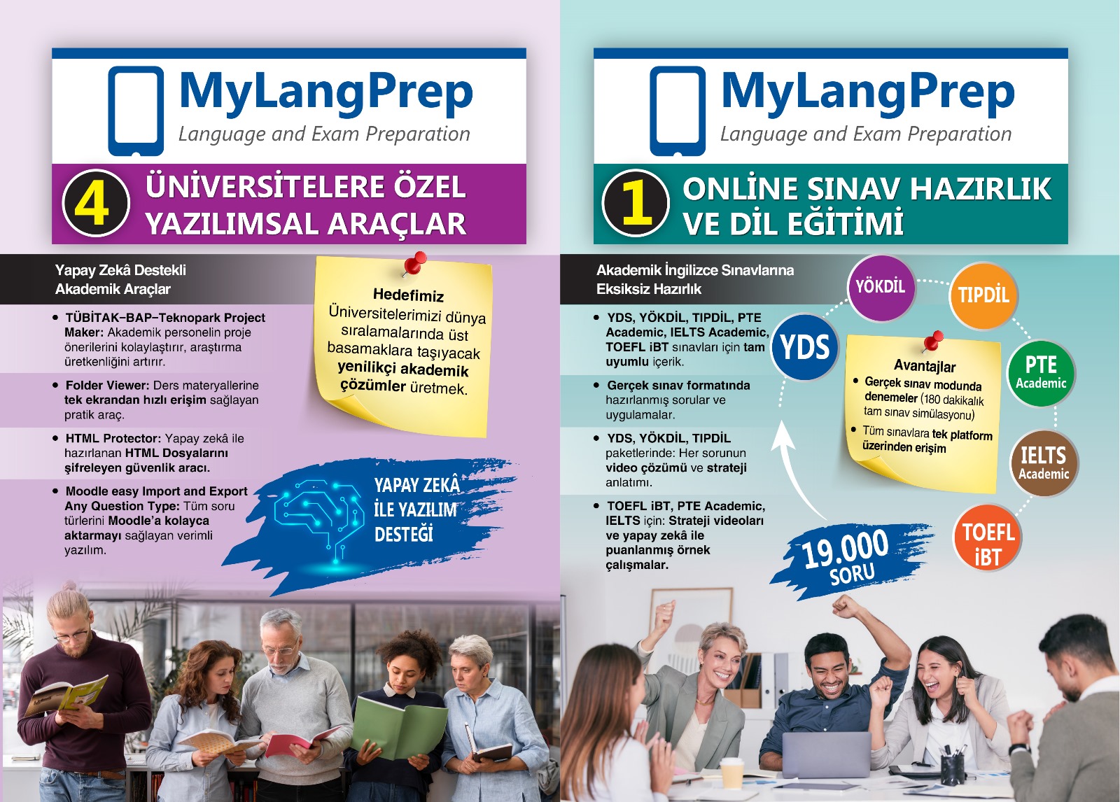 MyLangPrep, (e) YDS, YÖKDİL, TIPDİL, PTE, IELTS, TOEFL iBT gibi yabancı dil sınavlarına hazırlık imkânı sunmakta, ayrıca Genel İngilizce eğitimleri ve özellikle konuşma becerisini geliştirmeye yönelik içerikler barındırmaktadır. Bunun yanında, akademisyenlere yönelik yapay zekâ destekli araçlarla verimliliği artırıcı ve iş yükünü azaltıcı çözümler sunmaktadır.