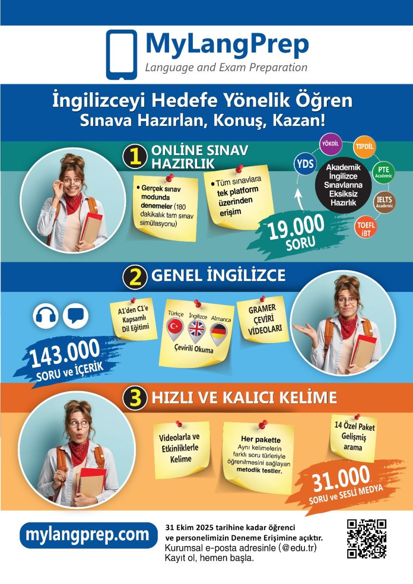 Başkanlığımız tarafından sağlanan deneme erişimi kapsamında, MyLangPrep Online Sınav Hazırlık ve Dil Eğitimi Veri Tabanı 31 Ekim 2025 tarihine kadar tüm öğrenci, akademik ve idari personelimizin kullanımına açılmıştır.