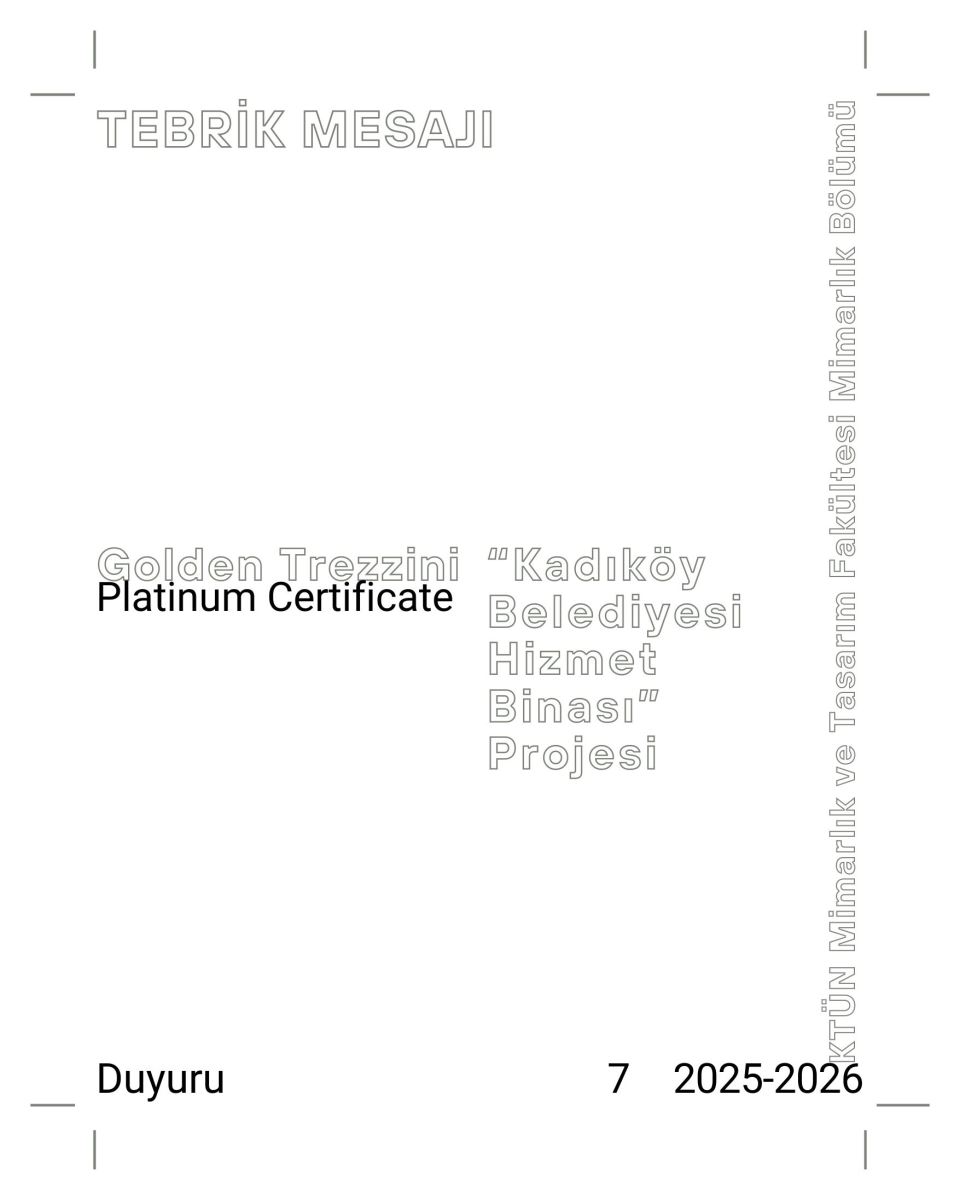 Bölümümüz öğretim üyelerinden Doç. Dr. Ömer Özeren, Prof. Dr. Bilgehan Yılmaz ve Arş. Gör. Dr. Edibe Begüm Özeren hocalarımızın yer aldığı ekibin "Kadıköy Belediyesi Hizmet Binası"na dair proje önerisi, Gold Trezzini 2025 ödüllerinden Platinum Certificate ile ödüllendirilmiştir. Hocalarımızı ve ekibin diğer üyelerini tebrik ediyoruz.
