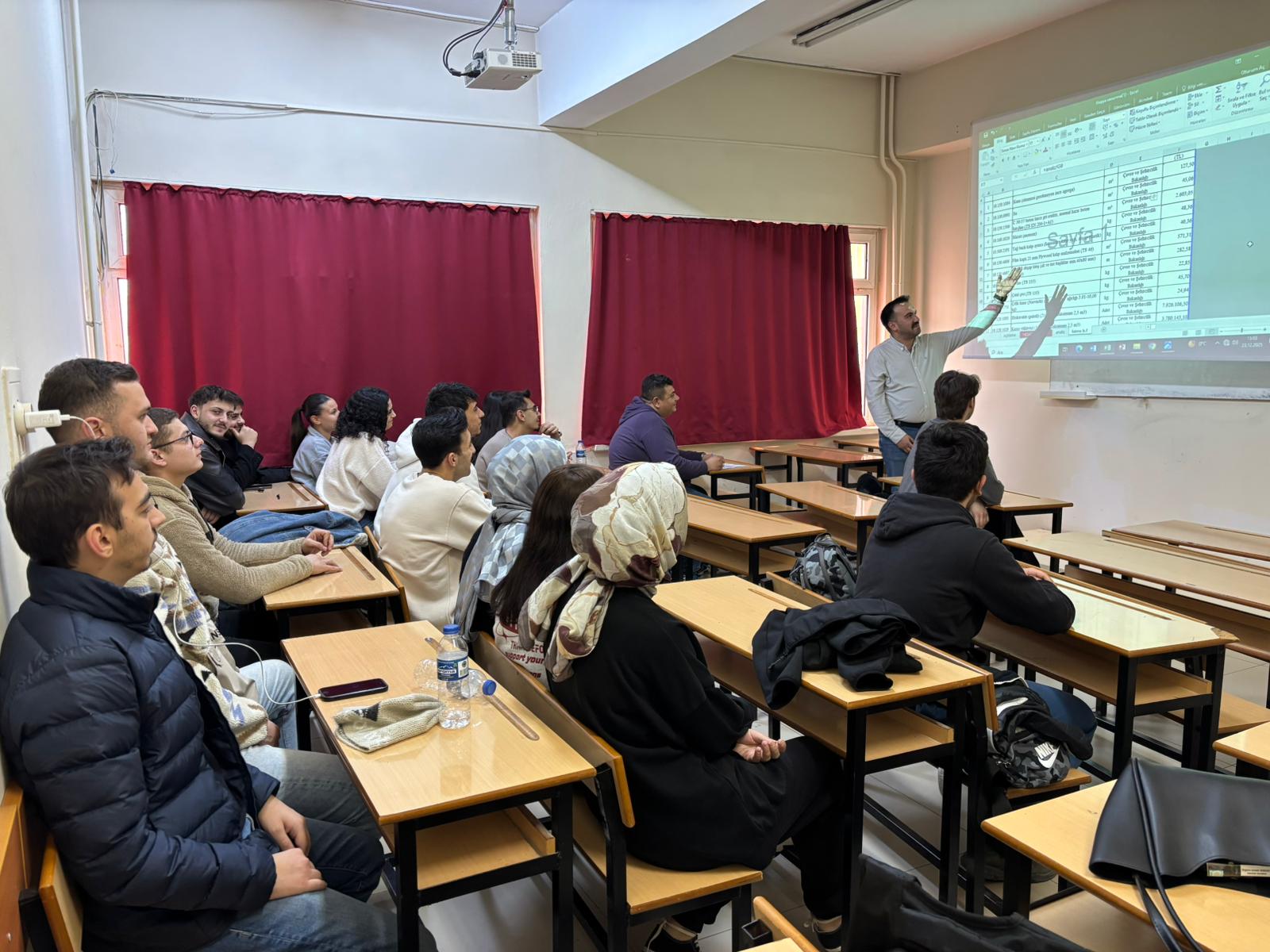 Öğrencilerimiz, derste öğrendikleri teorik hesaplamaların bir müteahhit veya kontrol mühendisi gözüyle nasıl yönetildiğini birinci ağızdan dinleme fırsatı buldular. Sunumun ardından gerçekleştirilen soru-cevap bölümünde; şantiye yönetimi, birim fiyat analizleri ve güncel piyasa koşullarında yapı ekonomisinin önemi üzerine interaktif bir tartışma yürütülmüştür.
