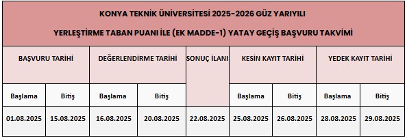 2025-2026 eğitim-öğretim yılı güz yarıyılı Yerleştirme Taban Puanı (Ek Madde-1) ile yatay geçiş işlemleri hakkında detaylı bilgiye aşağıda yer alan yatay geçiş rehberinden ulaşabilirsiniz.