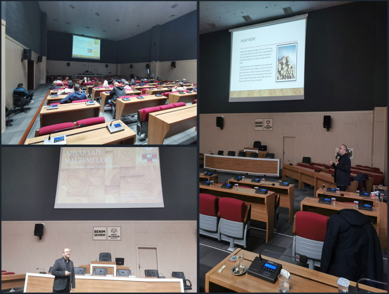 Üniversitemiz Teknik Bilimler Meslek Yüksekokulu ile Sürekli Eğitim Uygulama ve Araştırma Merkezi (KTÜNSEM), Konya Büyükşehir Belediyesi Makine İkmal, Bakım ve Onarım Dairesi Başkanlığı iş birliğiyle “İç ve Dış Cephelerde Kullanılan Ahşap Yapı Malzemeleri” başlıklı bir eğitim programı gerçekleştirdi.